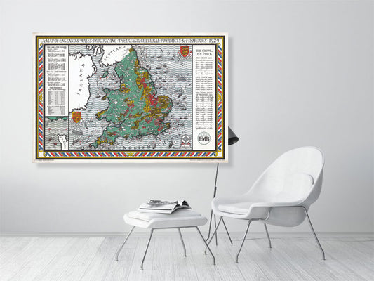 1929 Map of England and Wales Portraying Agricultural Products and Fisheries